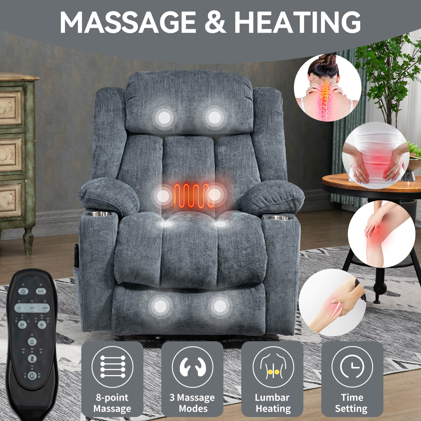 Yes—this heat and massage lift chair includes 8-point massage, 3 modes, and a timer, plus a heating function (commonly used for lumbar comfort). Great for people searching power lift recliner with heat and massage.